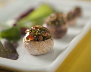 Cogumelos recheados com cebola marinada em mel de pimenta