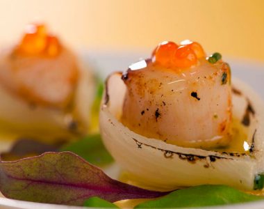 Copinhos de cebola com vieiras e ovas de salmão