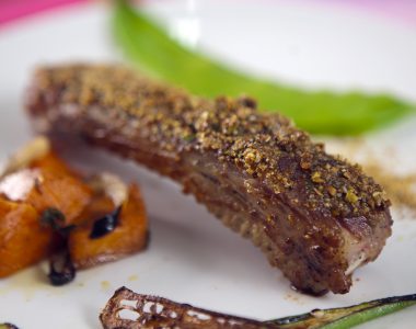 Costelinha suína em crosta de pistache e mel de eucalipto