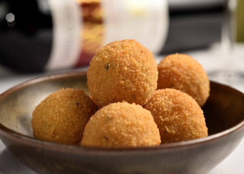 Coloque em sua mão uma colherada do arroz, faça um buraco no centro, preencha com o recheio, feche e enrole como uma bolinha. Repita até o final do recheio. Enfarinhe as bolinhas de arroz, passe na farinha de rosca e no ovo batido e em seguida, na farinha de rosca novamente. Frite em uma panela com óleo quente e sirva imediatamente.