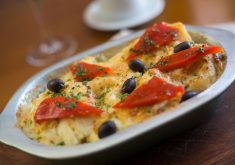 Bata 1 ovo inteiro e pincele o bacalhau, espalhe um pouquinho de parmesão por cima e decore com azeitonas pretas.