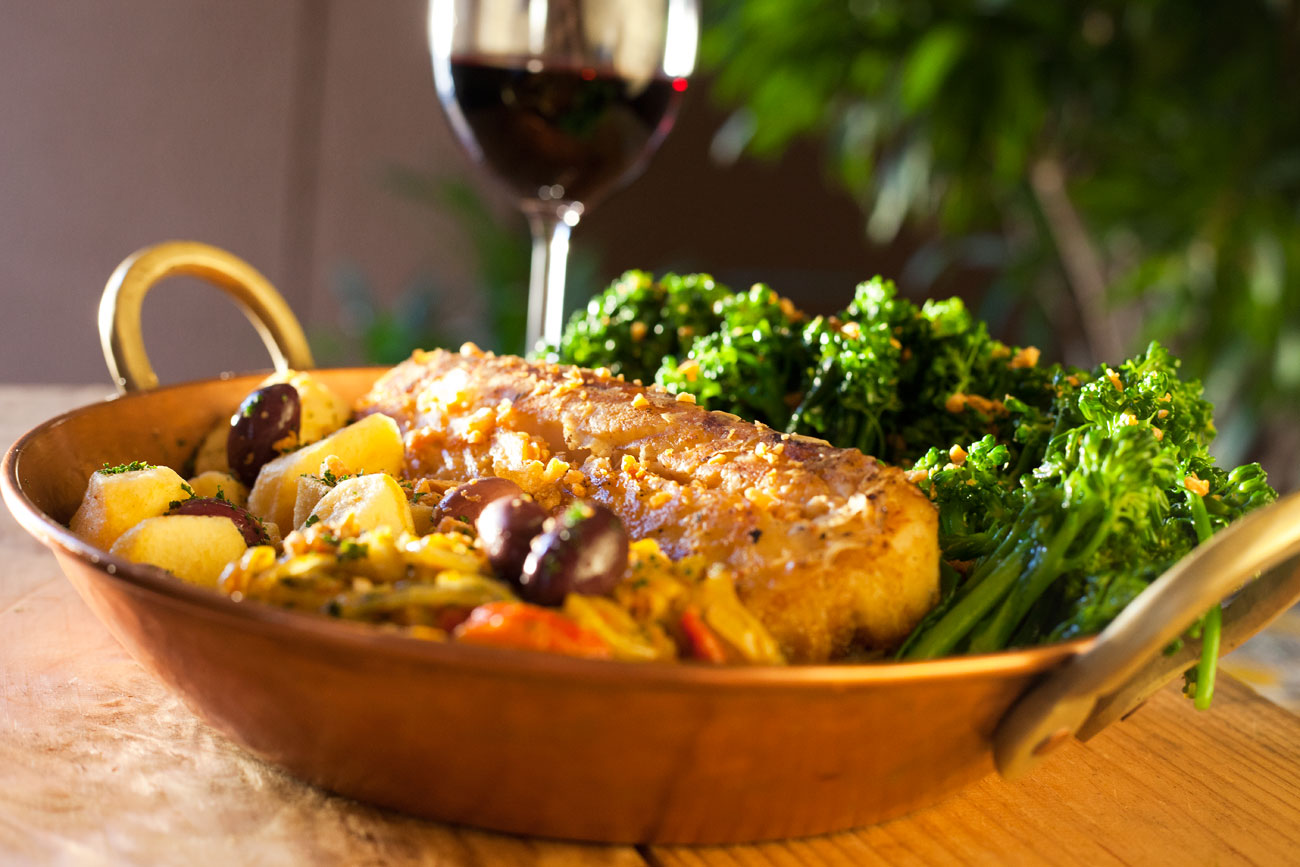 Seque o bacalhau com pano limpo e coloque na chapa ou frigideira grossa durante dez minutos de cada lado, regado com o azeite extra virgem, dourando rapidamente por todos os lados.