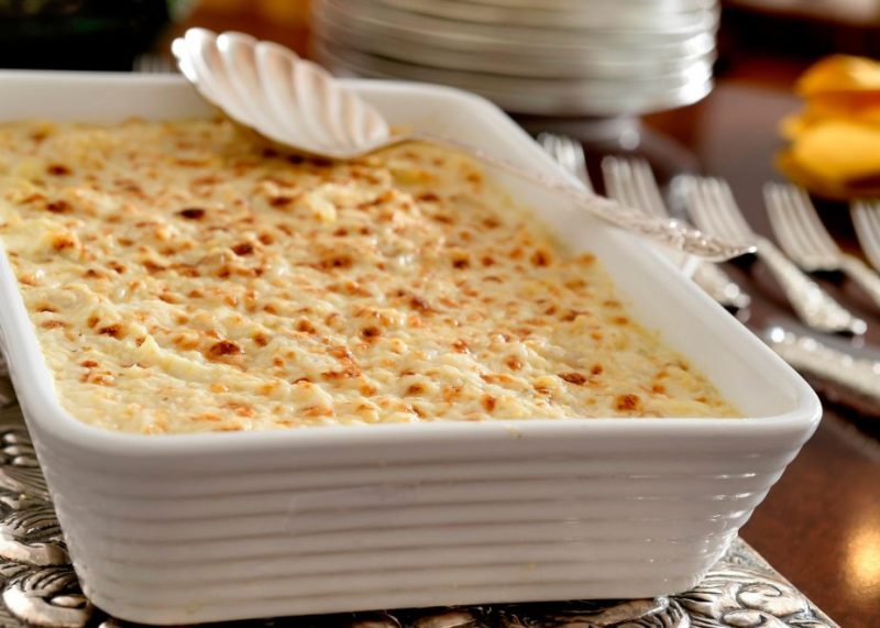 Transfira para uma tigela em vidro e adicione lentamente o creme de leite – previamente aquecido. Tempere com sal, pimenta e noz moscada. Em uma forma refratária, coloque o purê, sobre este o alho-poró e termine com a brandade de bacalhau. Finalize com queijo parmesão e leve ao forno para gratinar.