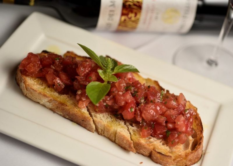 Retire a pele e as sementes dos tomates e corte em cubinhos. Pique finamente o manjericão juntamente com 1 dente de alho e acrescente aos tomates. Tempere com sal, pimenta e um pouco de azeite.