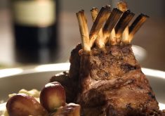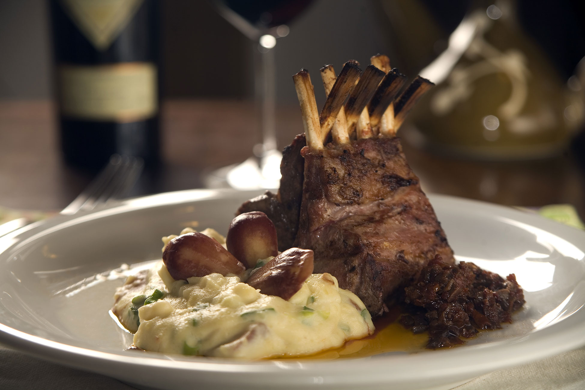 Para a carne: dividir o carré em duas partes (quatro costelas em cada parte), marinar em vinho branco, alho, sal e pimenta do reino, por aproximadamente 40 minutos. Grelhar em frigideira bem quente.