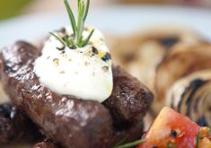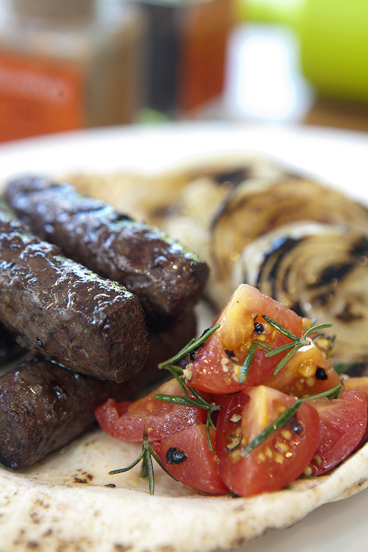 Sirva com pão pita aquecido acompanhado com cebolas grelhadas, tomate temperado com alecrim, pimenta-do-reino moída na hora e creme azedo.