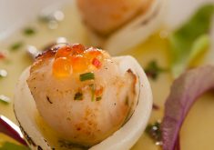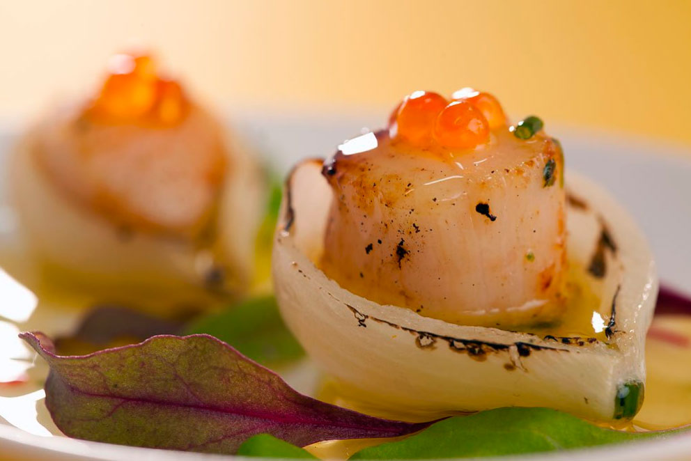 Montagem: Dentro de cada copinho de cebola coloque um pouco de azeite, uma vieira grelhada e finalize com ovas de salmão. Decore com ervas ou brotos e também azeite.