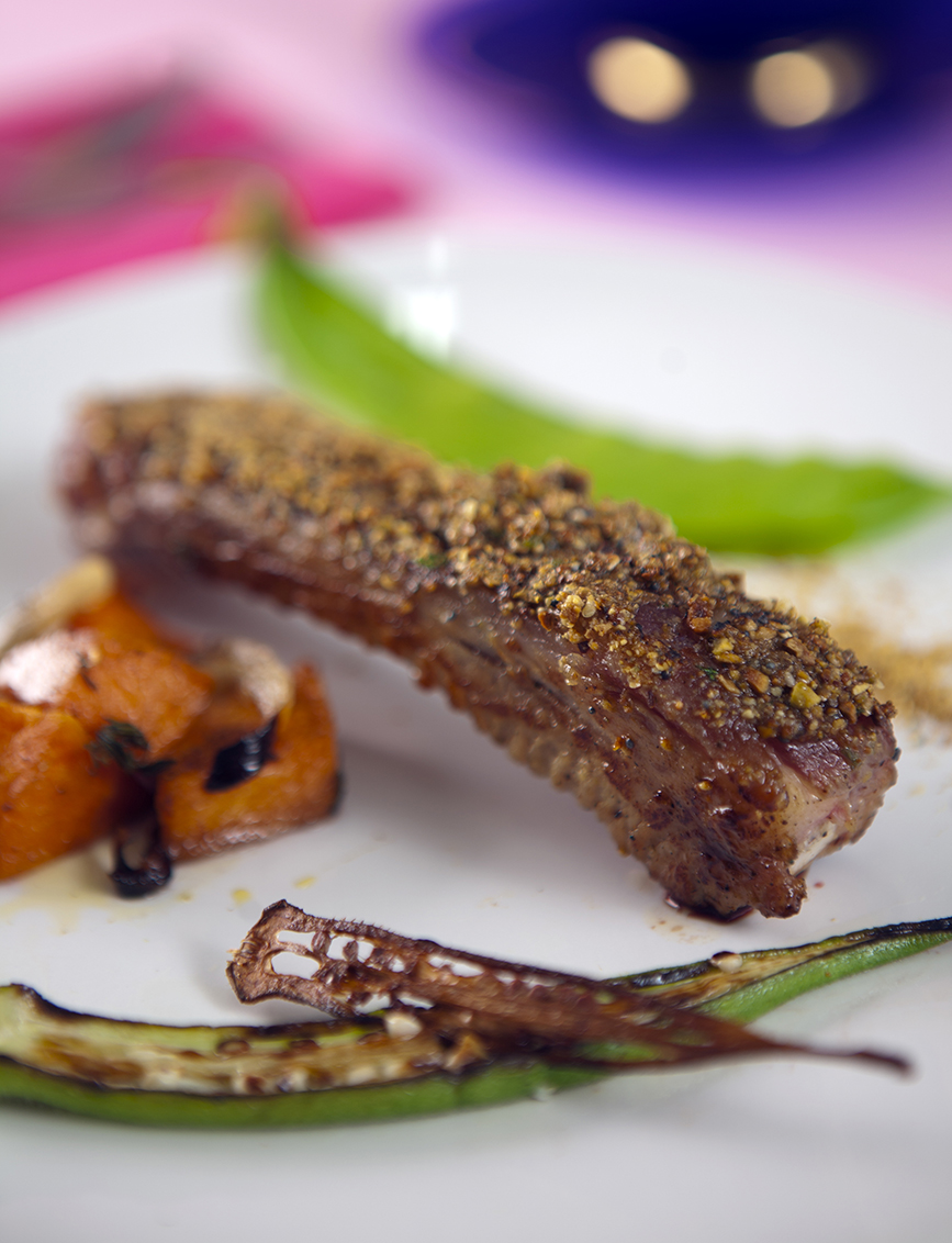 Tempere as costelinhas com sal e pimenta do reino e alho bem picado. Deixe descansar por 2 hs. Pincele com o mel as costelinhas e passe a parte de cima pelo pistache moído.