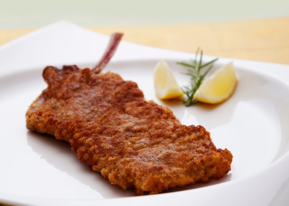 Em um prato fundo, coloque os ovos, bata bem e vá mergulhando, uma a uma, as bistecas, deixando de fora o osso. Passe na farinha de pão, retire o excesso e pressione bem com as mãos para que a farinha fique bem aderida à carne.