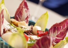 Misture bem e deixe pegar gosto durante 10 minutos. Decore com os pimentões, as endívias e salpique a salsinha picada por cima. Esta pronto para servir.