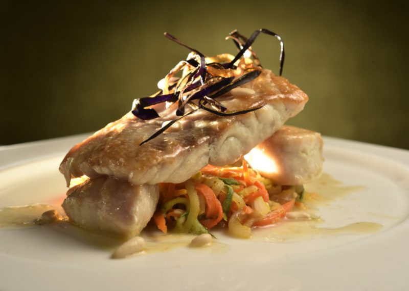 Tempere o peixe com o sal do Himalaia e baunilha e doure-os, levemente, na frigideira antiaderente com azeite preaquecido. Regue com o vinho branco, coloque os pinoli e tempere com o alecrim.