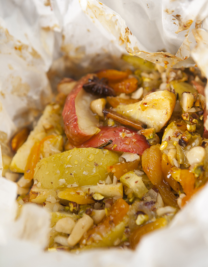 Fatie as frutas e pique grosseiramente as amêndoas, as nozes, as castanhas e o pistache. Corte um quadrado grande de papel-manteiga e coloque as frutas e as castanhas misturadas no centro do papel.