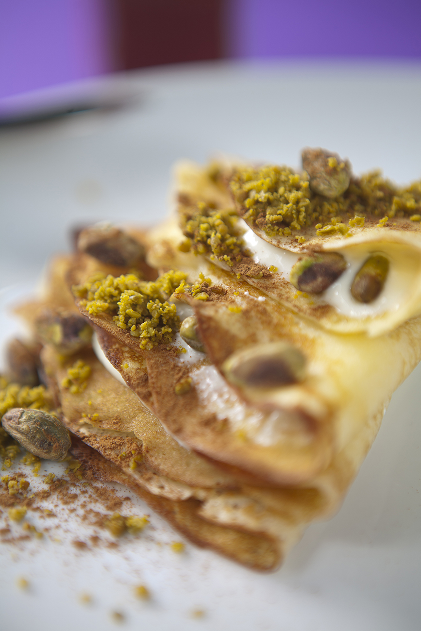 Misture todos os ingredientes do recheio, distribua 1 colher de sopa do recheio em cada crepe e enrole. Sirva polvilhado com canela e pistache.