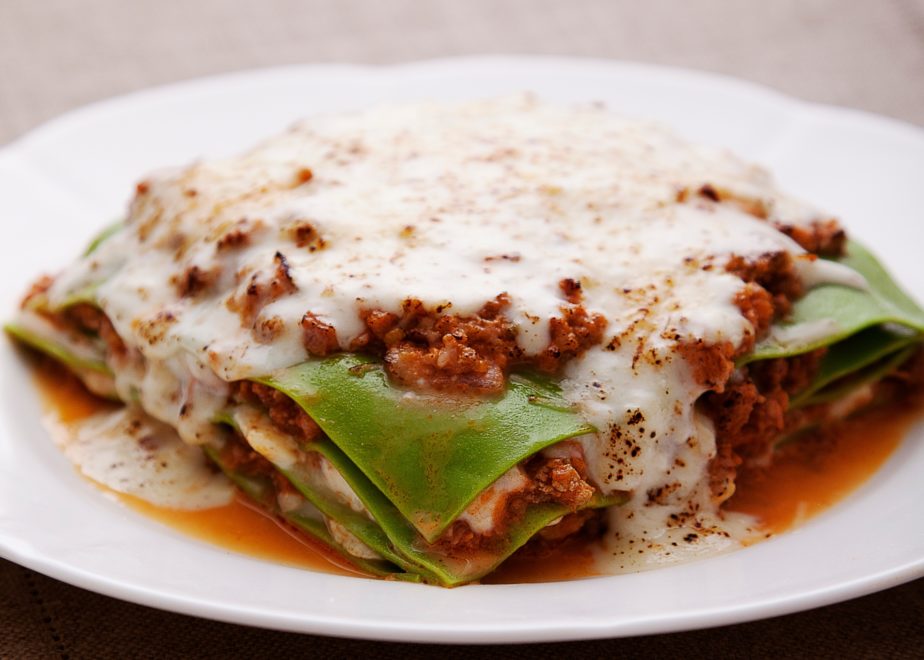 Unte com manteiga um refratário, coloque um pouco de molho no fundo e sobre este a massa, o molho vermelho e depois o branco. Repita até terminar com a massa e o molho. Polvilhe com parmesão e leve ao forno para gratinar por 30 minutos.