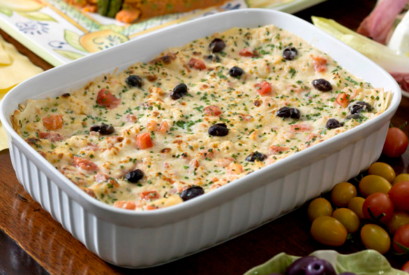 Refogue o alho e a cebola com o azeite, coloque os tomates e deixe murchar. Acrescente o bacalhau, regue com o vinho e deixe evaporar. Junte as azeitonas, o molho branco, verifique o sal e reserve.