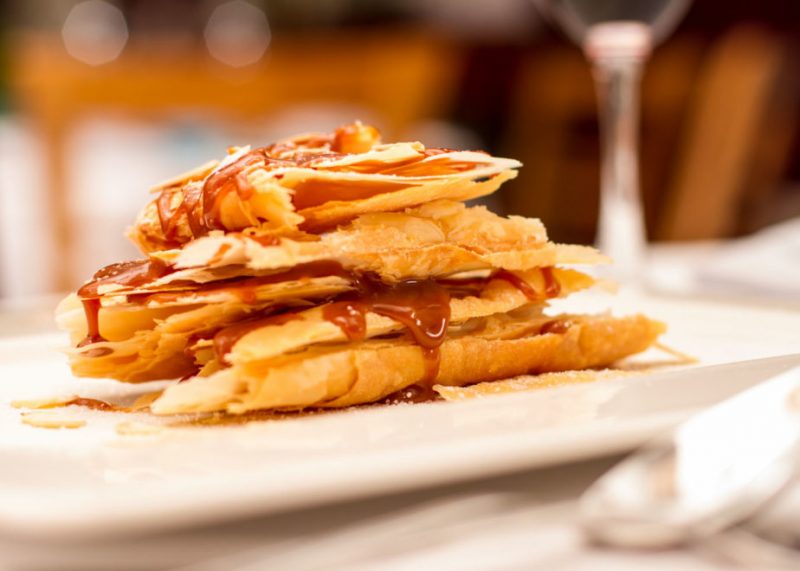 Após assados os retângulos, coloque um deles em uma travessa e espalhe parte do doce de leite por cima. Cubra com outro retângulo, repita a operação, terminando com uma camada de massa.