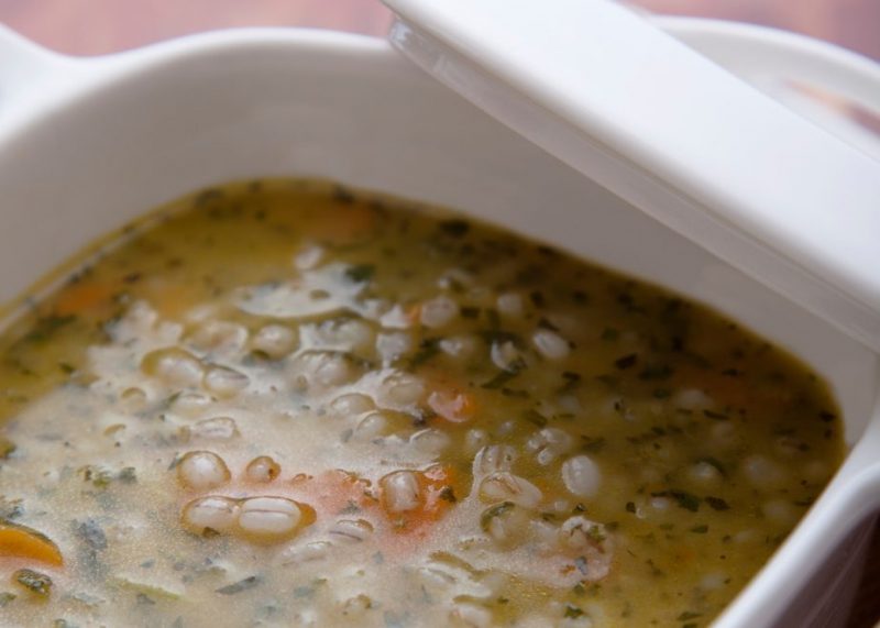Lave a cevada, coloque em uma panela, cubra com 2 litros de água fria e deixe ferver durante 30 minutos. Junte uma concha de caldo de carne. Neste meio tempo, prepare uma panela com cinco colheres de sopa de azeite, a cebola picada e as ervas picadas.