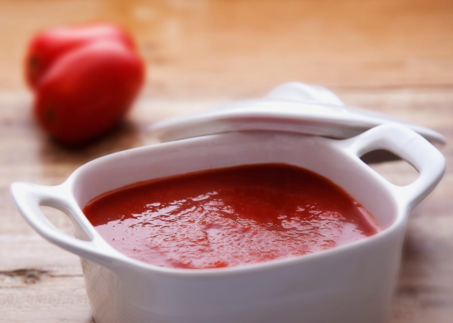 Em uma panela, coloque o azeite, a cenoura, a cebola, o salsão e refogue. Adicione a polpa de tomates, veja o sal e deixe apurar até obter um creme (extrato) de tomates.