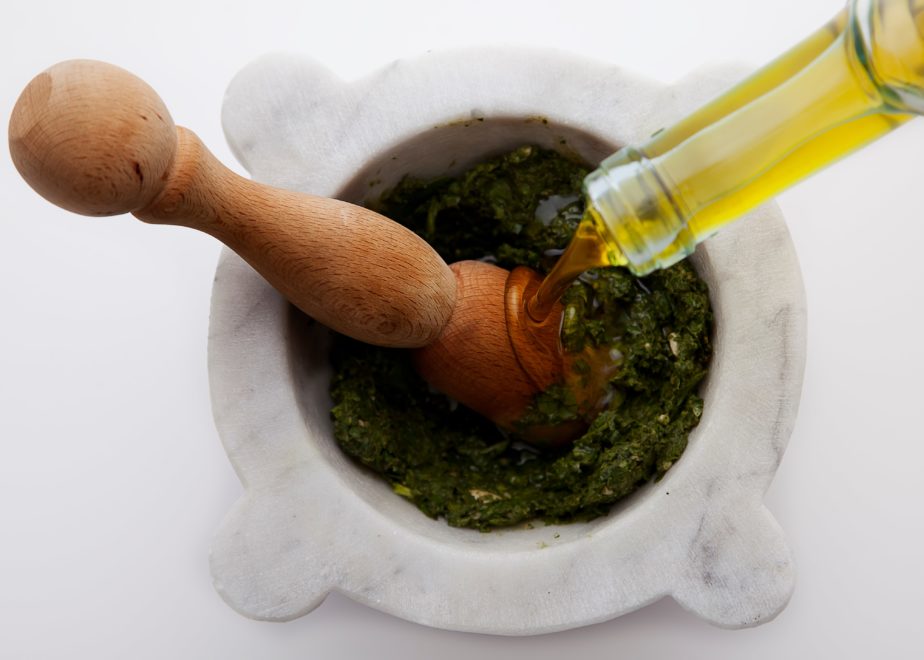 Desfolhe o manjericão, lave e enxugue as folhas. No liquidificador, bata o alho e o pinoli, acrescente as folhas de manjericão e, em seguida, o azeite. Vá acrescentando até conseguir bater sem dificuldade. Junte o parmesão e, por último, o sal; vá batendo sempre com intervalos (ligando e desligando o liquidificador, para não aquecer o pesto).