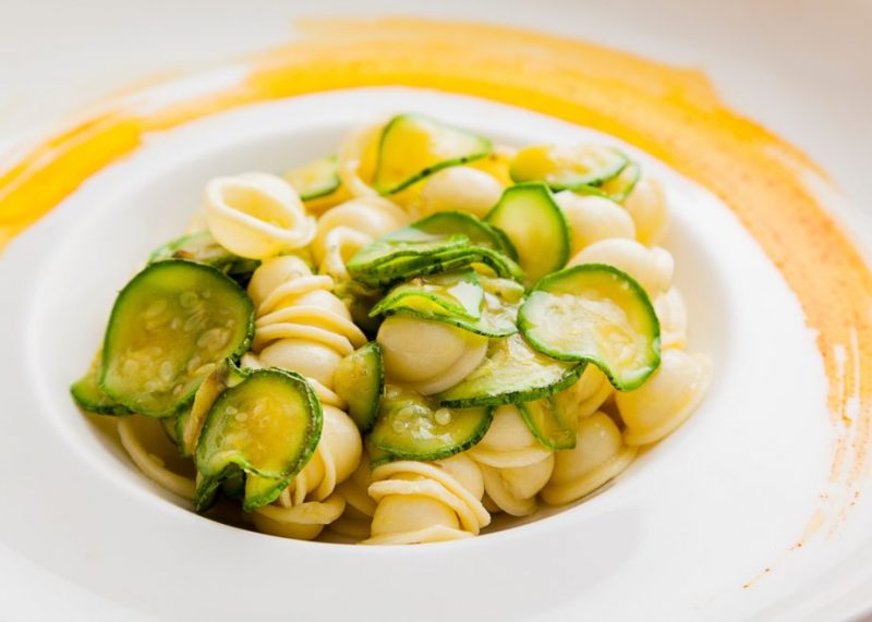 Orecchiette com abobrinha e camarões