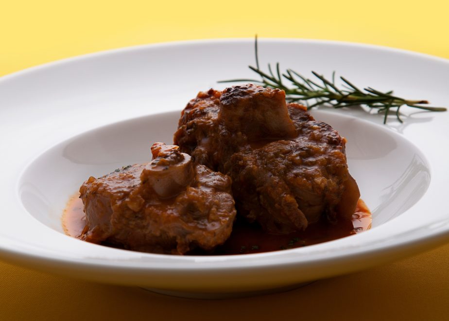 Em uma panela refogue a cebola, a cenoura e o salsão, coloque a carne e deixe dourar. Regue com o vinho, incorpore o extrato de tomate diluído no caldo de frango, coloque a sálvia e os alecrins picados; veja o sal, tampe e deixe cozinhar durante 45 minutos em fogo lento.