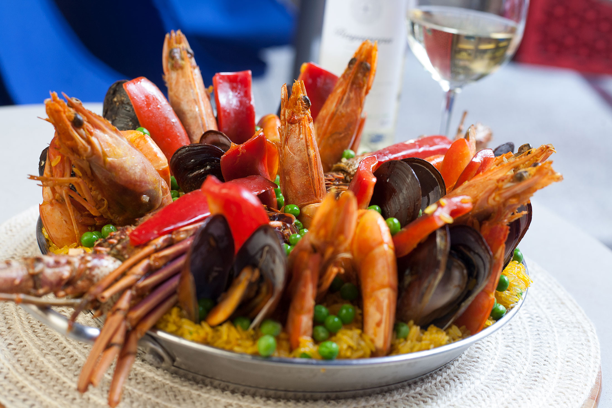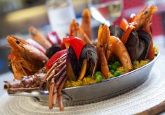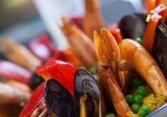 Para finalizar acrescente o açafrão dissolvido em uma xícara de água quente. Decore o prato comos pim entões assados e os camarões.