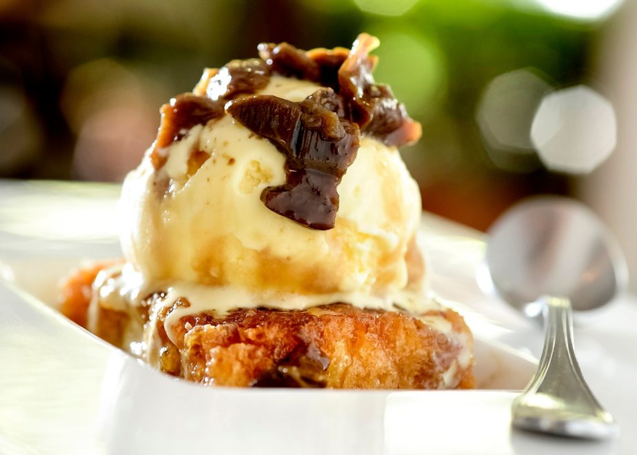 Preaqueça uma frigideira com a manteiga, coloque o restante do açúcar e deixe formar um caramelo. Coloque o brioche e caramelize dos dois lados.