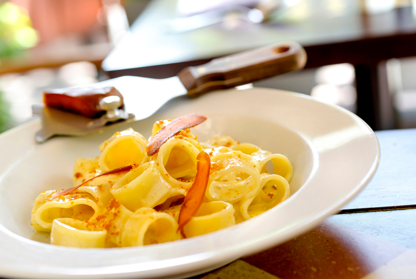 Cozinhe a massa al dente em abundante água filtrada com sal. Em seguida, escorra a massa e leve ao fogo na mesma frigideira que refogou a cebola na manteiga. Acrescente o creme de leite fresco, cozinhe por mais dois minutos e deixe que a massa absorva bem o creme; verifique o sal. Sirva temperada com a bottarga ralada e pimenta-do-reino moída na hora. Decore com as lâminas de bottarga.