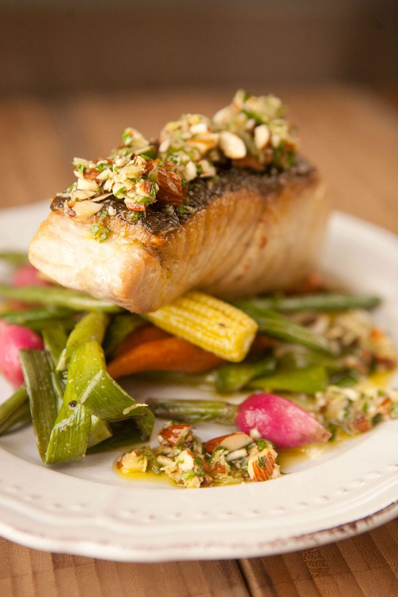 Montagem: Coloque os legumes no prato, sobre eles o peixe e finalize com o azeite de amêndoas sobre o peixe.