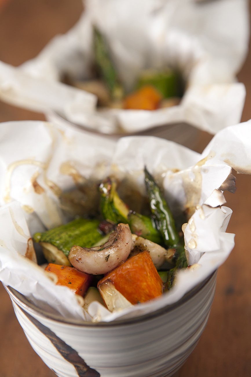 Corte quadrados de papel manteiga e encaixe dentro de tigelinhas. Coloque uma boa porção de legumes em cada uma e leve ao forno 180 graus por 20 min ou até que estejam começando a dourar.
