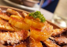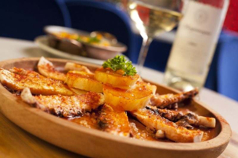 Após o cozimento, tirar a cabeça do polvo e cortar os tentáculos em láminas com uns 10 cm.