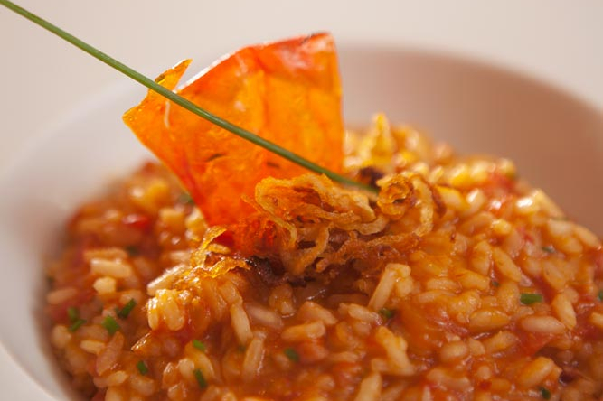 Corte em tiras o bacon (sem a gordura) e refogue o dente de alho junto com o mesmo, em fogo médio de 4 a 5 minutos. Quando estiver bem corado, junte a pimenta. Junte os tomates e cozinhe durante 10 minutos. Reserve. Toste o arroz no azeite e a cebola, regue com o vinho branco. Prossiga o cozimento regando com o caldo de legumes, quando estiver pronto junte o molho da outra frigideira, ajuste o sal e a pimenta, coloque a manteiga e o pecorino. Enfeite com as cascas de tomates desidratadas e cebolas fritas.