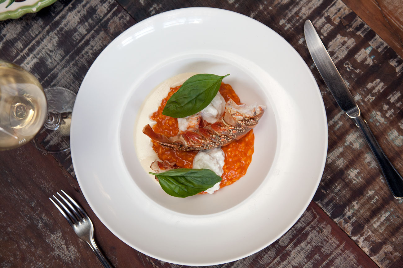 Adicionar o lagostin cortado em cubos e sevir, com a carcaça do lagostin para decorar e a burrata sobre o risoto.