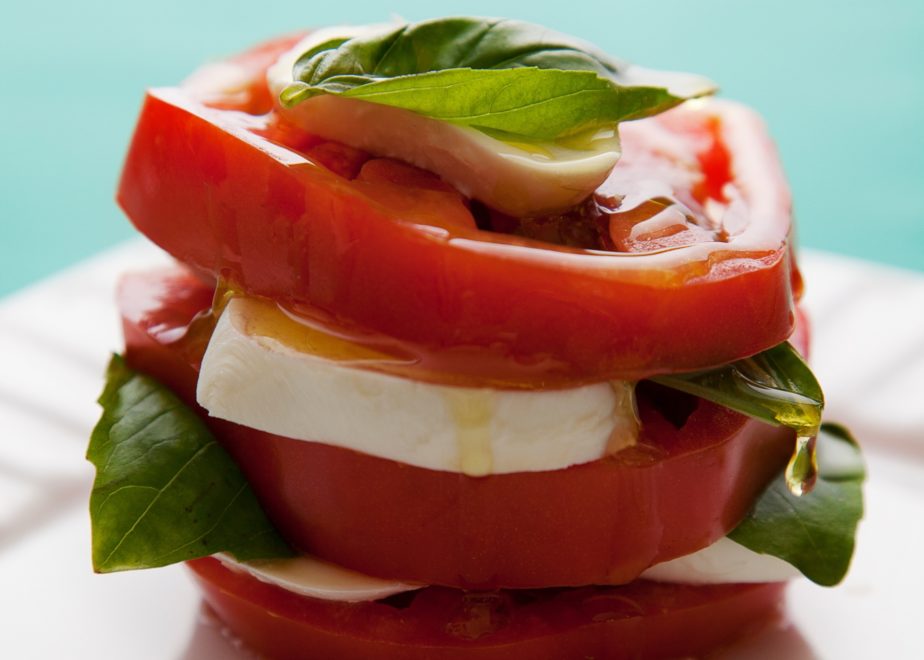 Disponha as fatias de mussarela e tomates alternadamente em um prato de servir. Distribua por cima as folhas de manjericão. Tempere com o azeite de oliva extravirgem, o sal e a pimenta-do-reino.