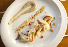 Colocar o bacalhau temperado no prato, cebola roxa sobre o bacalhau, creme de berinjela ao lado e “molica di pane”.