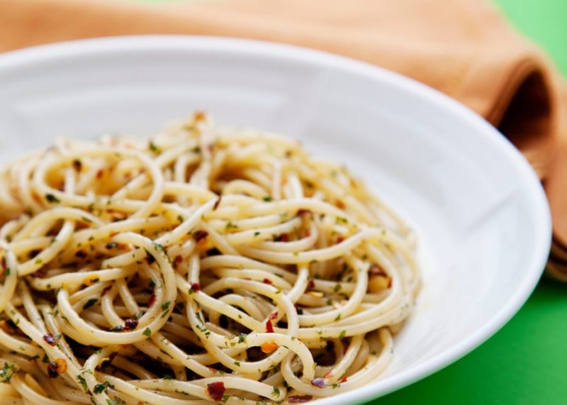Em uma panela grande, coloque a água para ferver. Aqueça o óleo em uma frigideira grande e frite o alho até que fique com uma leve cor dourada. Acrescente o peperoncino, a salsa e o sal. Deixe mais alguns minutos no fogo.
