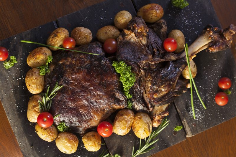 Após sair do forno, retire a paleta e coloque em uma travessa de serviço com a decoração e acompanhamentos de preferência. Coe todo o caldo que sobrou no recipiente, coloque em uma panela e leve a fogo médio até reduzir 50% do volume.
