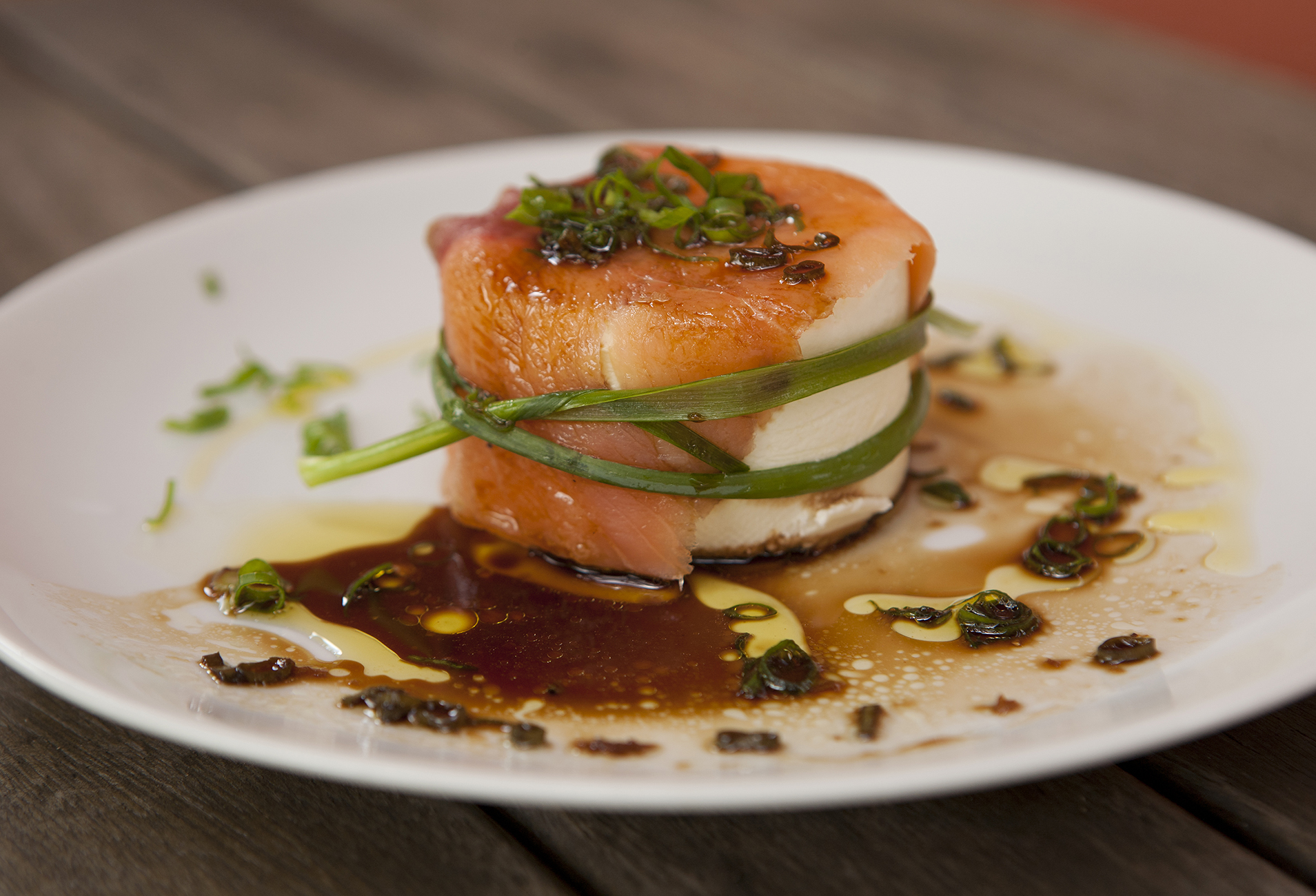 Montagem: Despeje o peixe temperado dentro da forma sobre a camada de queijo de cabra, com auxilio de uma colher. Finalize com o empurrador para dar forma à terrine. Acrescente por cima a ciboulette fatiada e uma colher de sopa do molho. Risque o prato ao redor com o molho e distribua algumas fatias finas de ciboulettes ao redor.